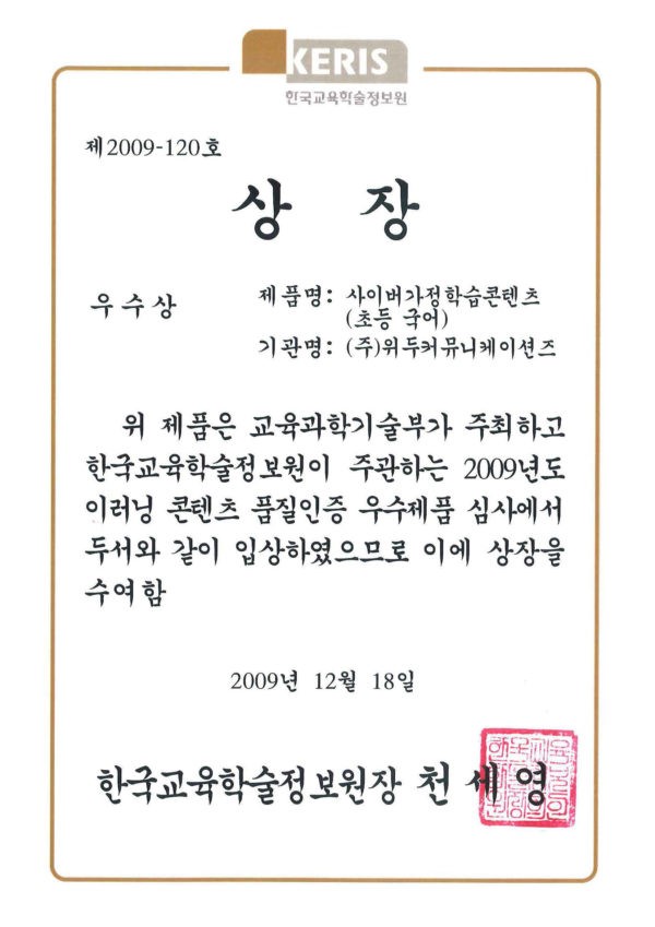 이러닝 콘텐츠 품질 인증 우수 심사 페이지 정보 작성자 WeDu 댓글 0건 조회 5,138회 작성일 19-05-30 19:32 본문 2009-12-18 우수상 제 2009-120호 이러닝 콘텐츠 품질 인증 우수 심사 한국교육학술정보원장 천세영 List Previous이러닝 기업의 수요 창출과 품질 향상 19.05.30 Next제 8회 디지털 이노베이션 대상 19.05.30