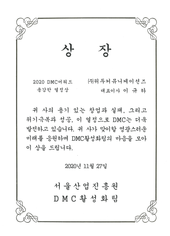 2020 서울산업진흥원 2020 DMC어워드 페이지 정보 작성자 WeDu 댓글 0건 조회 4,492회 작성일 21-12-31 12:57 본문 2020-11-27 2020 DMC어워드 용감한 열정상 서울산업진흥원 DMC활성화팀 List Previous2020 기술혁신 우수기업 21.12.31 Next2018 소년한국 우수 어린이 도서 19.05.30