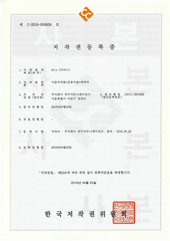 [한국/저작권] 아리스 페이지 정보 작성자 WeDu 댓글 0건 조회 5,115회 작성일 19-05-30 19:09 본문 2016-04-22 저작권 C-2016-009839 아리스 / 미술저작물>응용미술>캐릭터 List Previous[한국/저작권] 필립 19.05.30 Next[한국/저작권] 리안 19.05.30