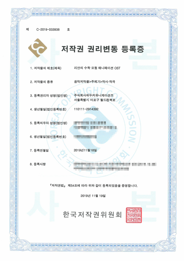 [한국/저작권] 리안의 수학 모험 애니메이션 OST 페이지 정보 작성자 WeDu 댓글 0건 조회 5,526회 작성일 19-11-25 13:54 본문 2019-11-18 저작권 C-2019-033938 음악저작물>주제가>작사·작곡 List Previous[한국/저작권] 리안의 수학 모험 여정의 시작 1,2,3,4,5 21.12.31 Next[한국/저작권] 애니메이션 리안의 수학 모험 19.11.25