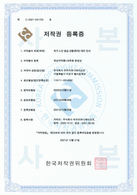 [한국/저작권] 독거 노인 응급 상황(화재) 대피 안내 페이지 정보 작성자 WeDu 댓글 0건 조회 5,100회 작성일 21-12-31 12:41 본문 2021-10-21 저작권 C-2021-041725 영상저작물>교육용 동영상 List Previous[한국/저작권] 장보기 인지훈련 게임 21.12.31 Next[한국/저작권] OLL KIDS/MATH 21.12.31