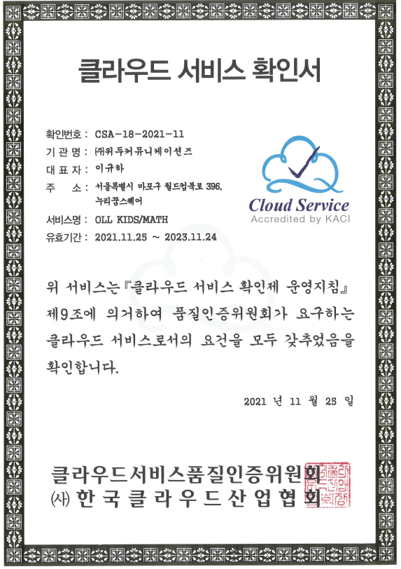 [한국/인증서] OLL KIDS/MATH 클라우드 서비스 확인서 페이지 정보 작성자 WeDu 댓글 0건 조회 7,899회 작성일 21-12-31 12:46 본문 2021-11-25 확인번호 CSA-18-2021-11 서비스명 : OLL KIDS/MATH List Previous[한국/확인서] OLL KIDS/MATH 파스-타 호환성 확인서 21.12.31 Next[한국/저작권] 장보기 인지훈련 게임 21.12.31