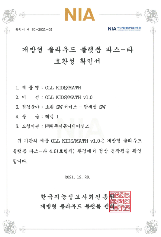 [한국/확인서] OLL KIDS/MATH 파스-타 호환성 확인서 페이지 정보 작성자 WeDu 댓글 0건 조회 8,222회 작성일 21-12-31 12:48 본문 2021-12-29 확인서 제 SC-2021-09 점검분야 : 호환 SW서비스 - 탑재형 SW List Next[한국/인증서] OLL KIDS/MATH 클라우드 서비스 확인서 21.12.31