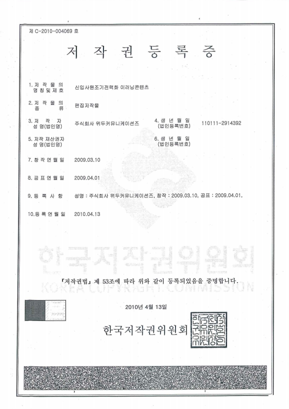 [한국/저작권] 신입사원조기전력화 이러닝 콘텐츠 페이지 정보 작성자 WeDu 댓글 0건 조회 4,930회 작성일 19-05-30 19:01 본문 2010-04-13 저작권 C-2010-004069 신입사원조기전력화 이러닝콘텐츠 / 편집저작물 List Previous[한국/저작권] 리안의 수학 모험 19.05.30 Next[한국/상표] OLL 41류 19.05.30